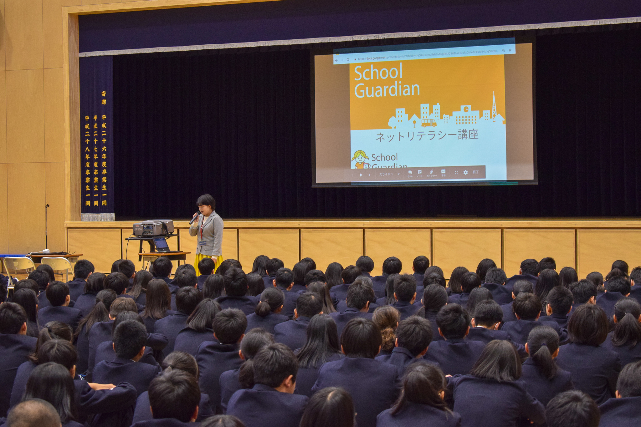 4月9日(火)本校体育館で,スクールガーディアンによる,ネットリテラシー教育が行われました。 SNSの使用上の注意や,ネットを正しく利用しするための心構えについて講演していただきました。 講演後に質問する生徒も見られ,生徒たちは身近なネットに潜む危険性を学習することができました。