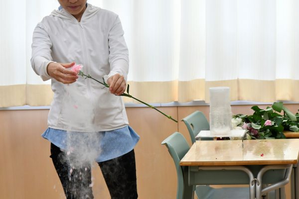 バラの花を一瞬で凍らせて,物質の変化についての実験が行われました。