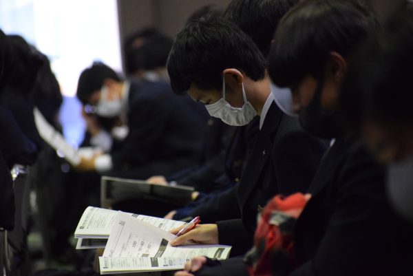 2年生も後半を迎え,いよいよ自身の進路に本格的に向き合う意識が芽生え始め,生徒たちは真剣に話をきいていました。
