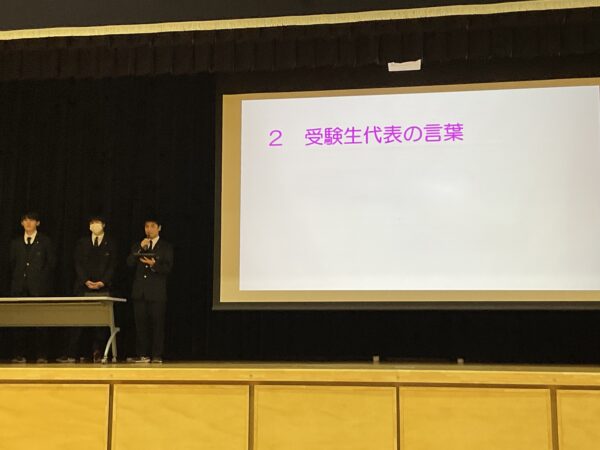 はじめに、学校長から激励の言葉が贈られ、受験生一人ひとりの努力を称えながら、本番に向けた心構えについて語られました。静かに耳を傾ける生徒たちの表情からは、決意の強さが感じられました。