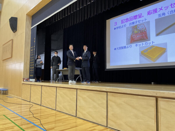 その後、学校からの記念品として鉛筆やキットカットが贈られ、緊張の中にも和やかな雰囲気が広がりました。