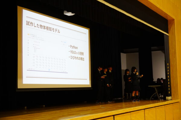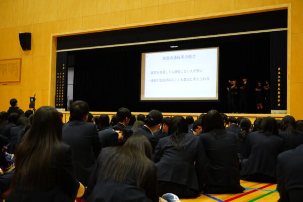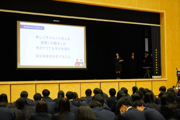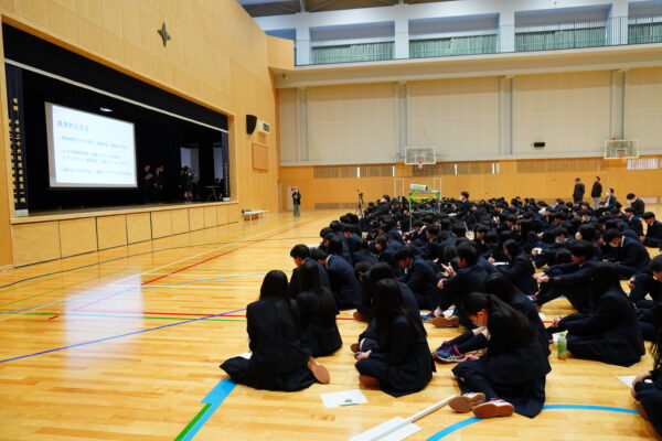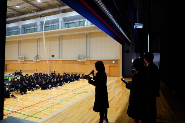 現在3年生(進路決定者)は,特別授業を実施しており,「社会で起きている課題」についての解決方法を考えることを目標に各チームで調査・探究活動を行ってきました。本日は特別授業の最終日となり,各クラスの選抜チームが体育館にて発表を行いました。