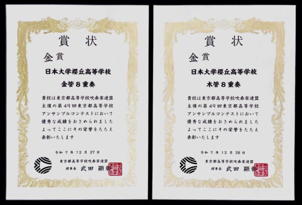 令和7年12月27日(土)・28日(日)に開催された「第49回東京都高等学校アンサンブルコンテスト」において、本校吹奏楽部が以下の成績を収めました。
