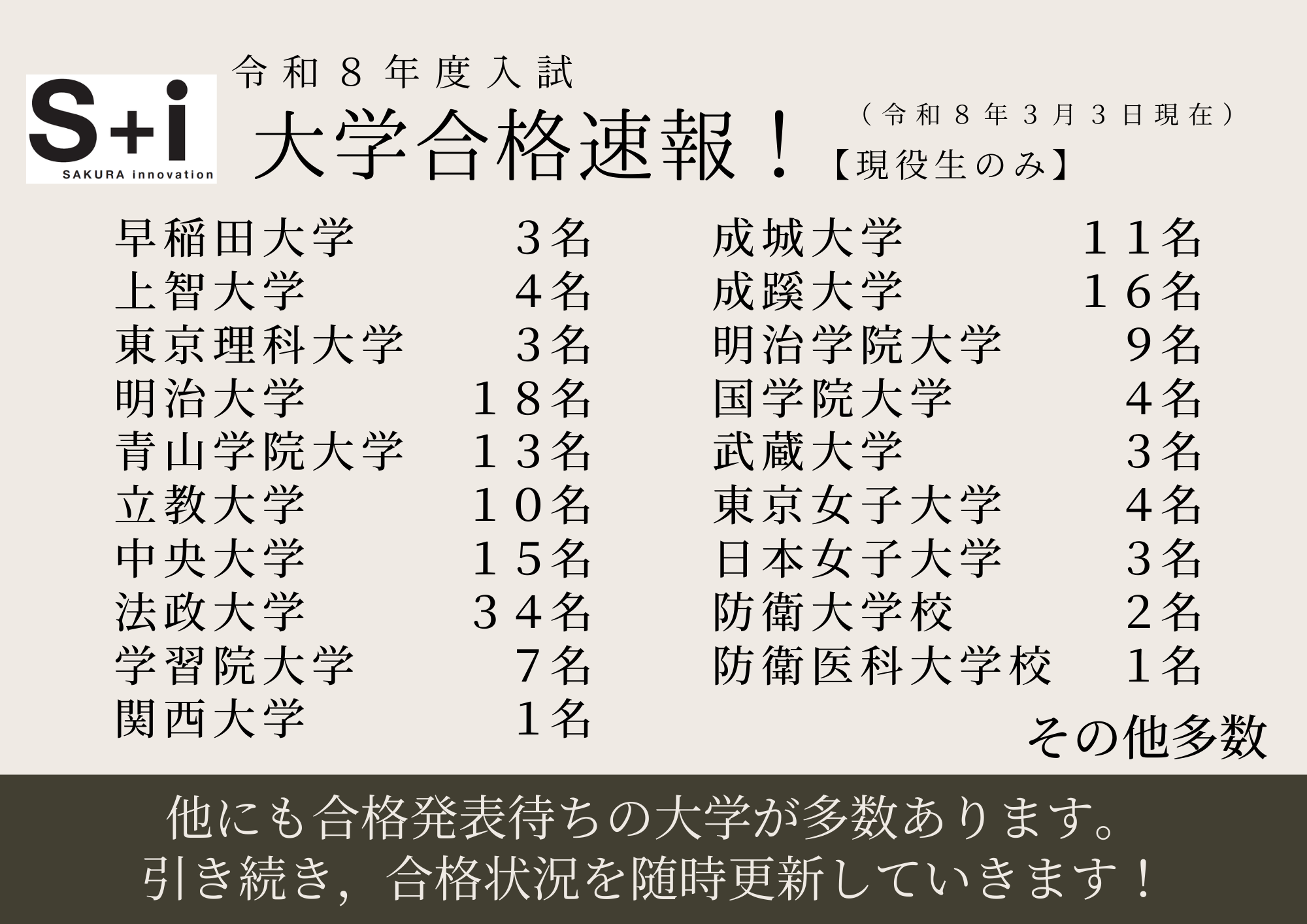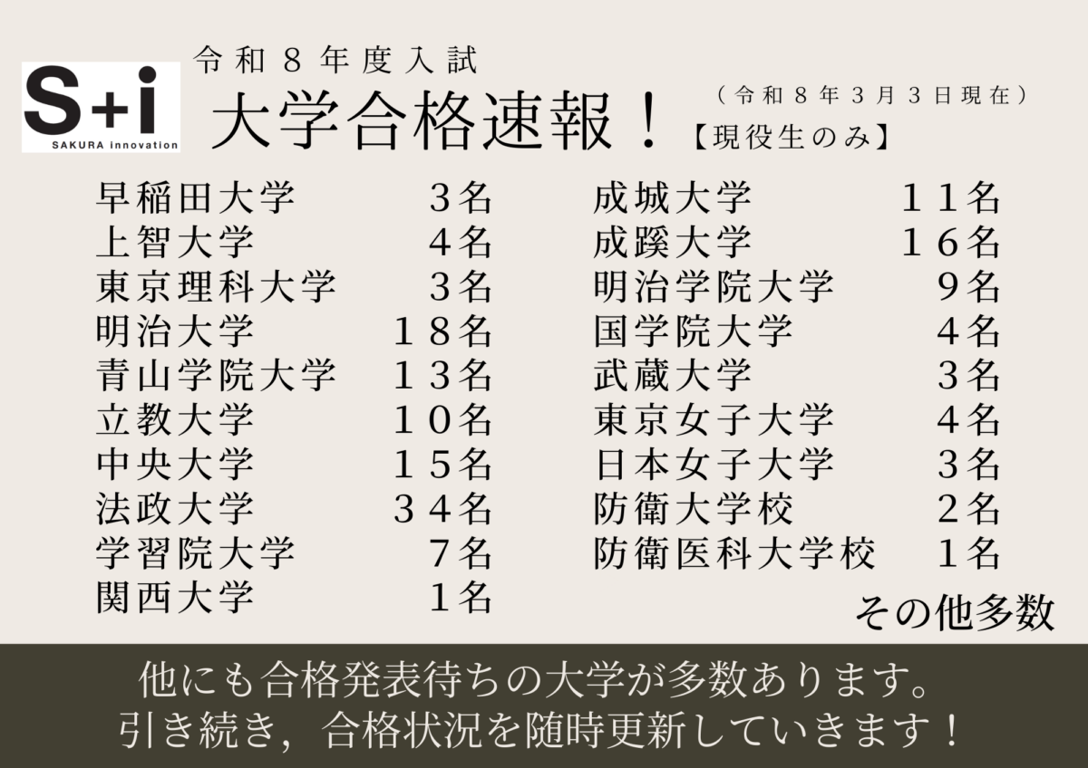 令和8年3月3日現在での大学入試合格速報をお知らせします。
