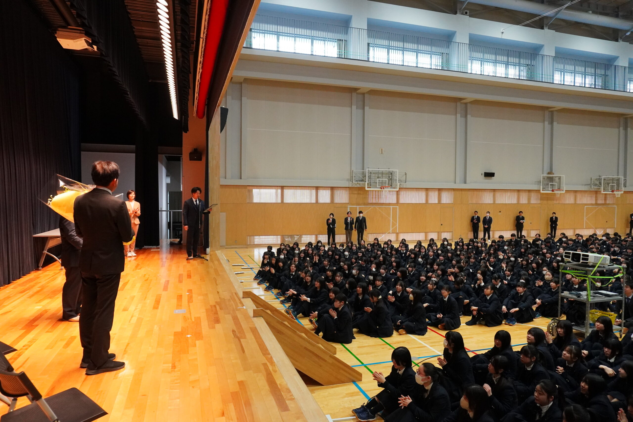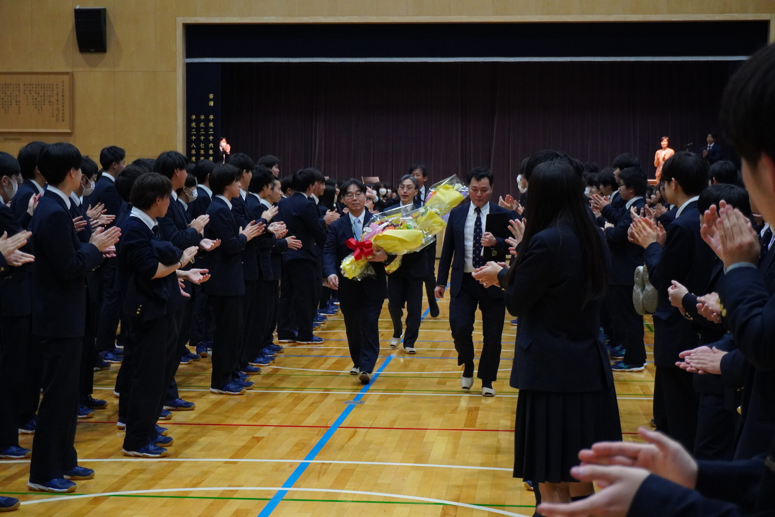 修了式後には今年度で本校を離れる先生方の離任式も行われ,花束の贈呈と,生徒たちで花道をつくって送り出しました。