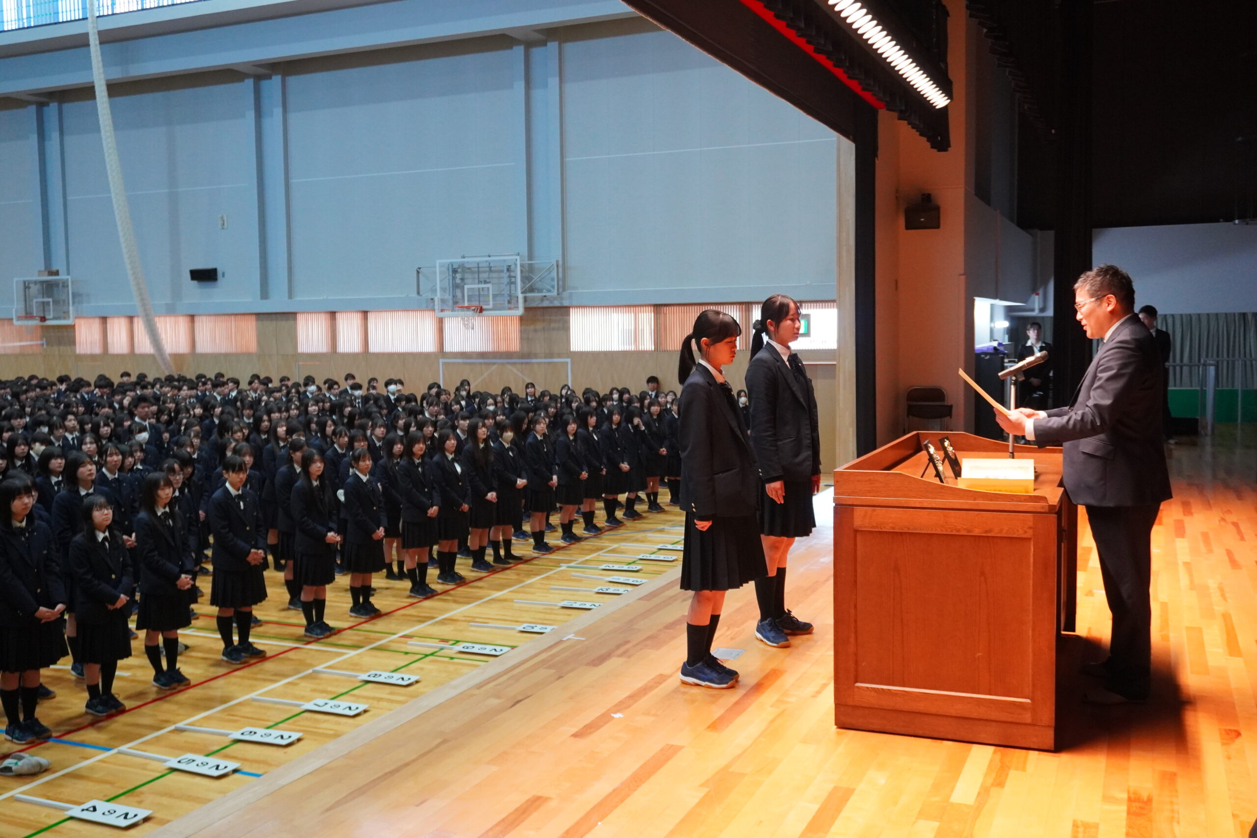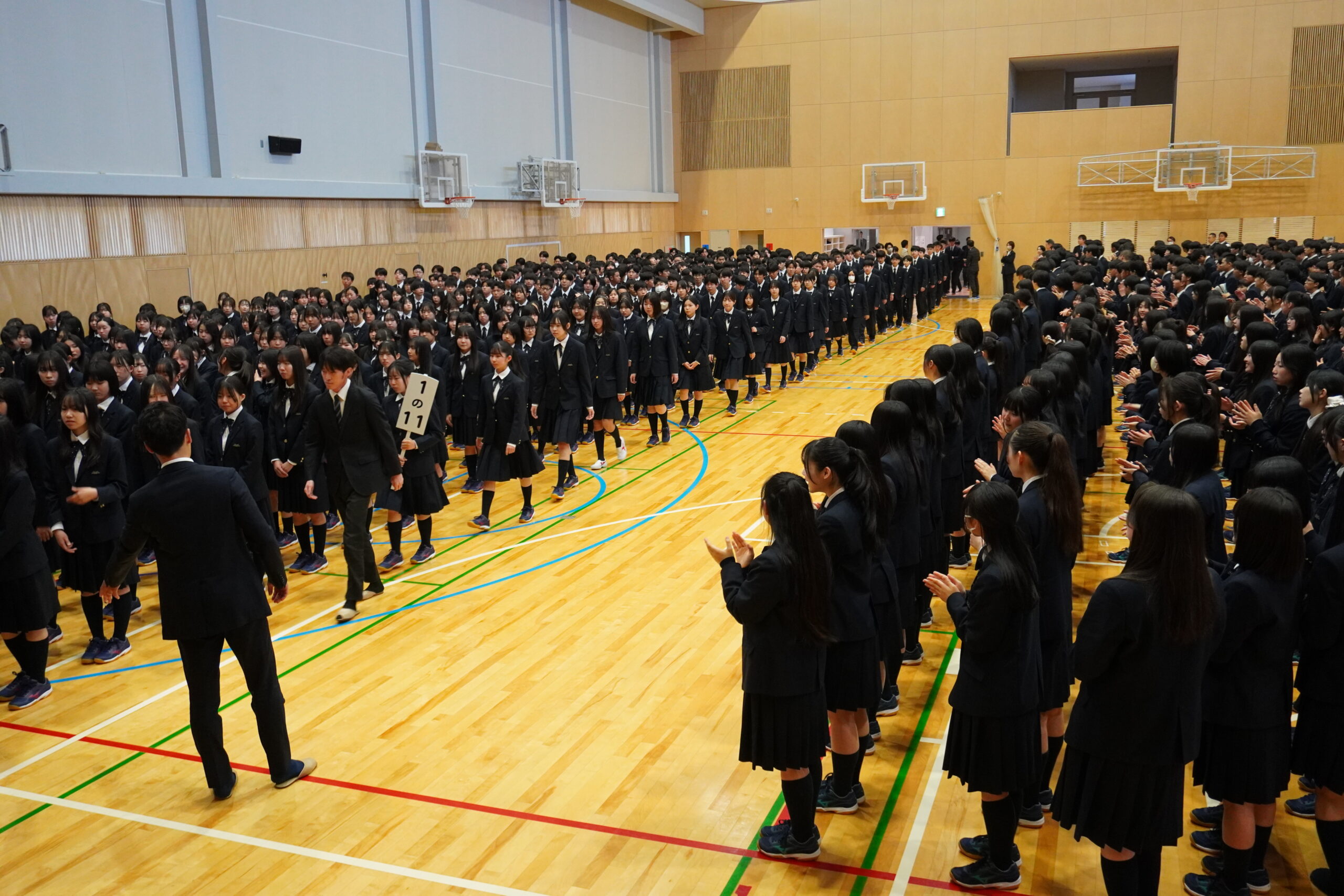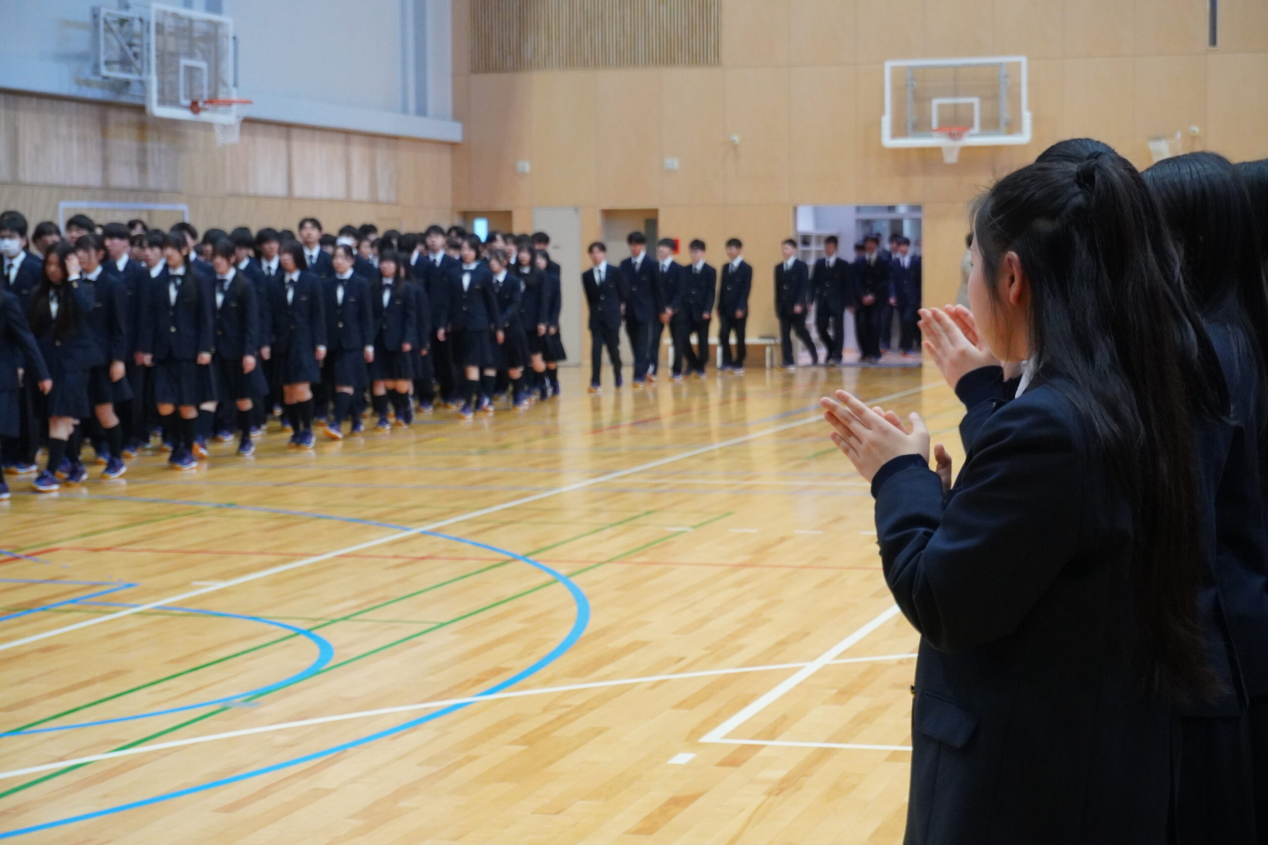 始業式に先立って行われた対面式では,緊張の面持ちで入場する新入生を在校生があたたかな拍手で迎え,生徒たちの思いやりを感じることのできる機会となりました。