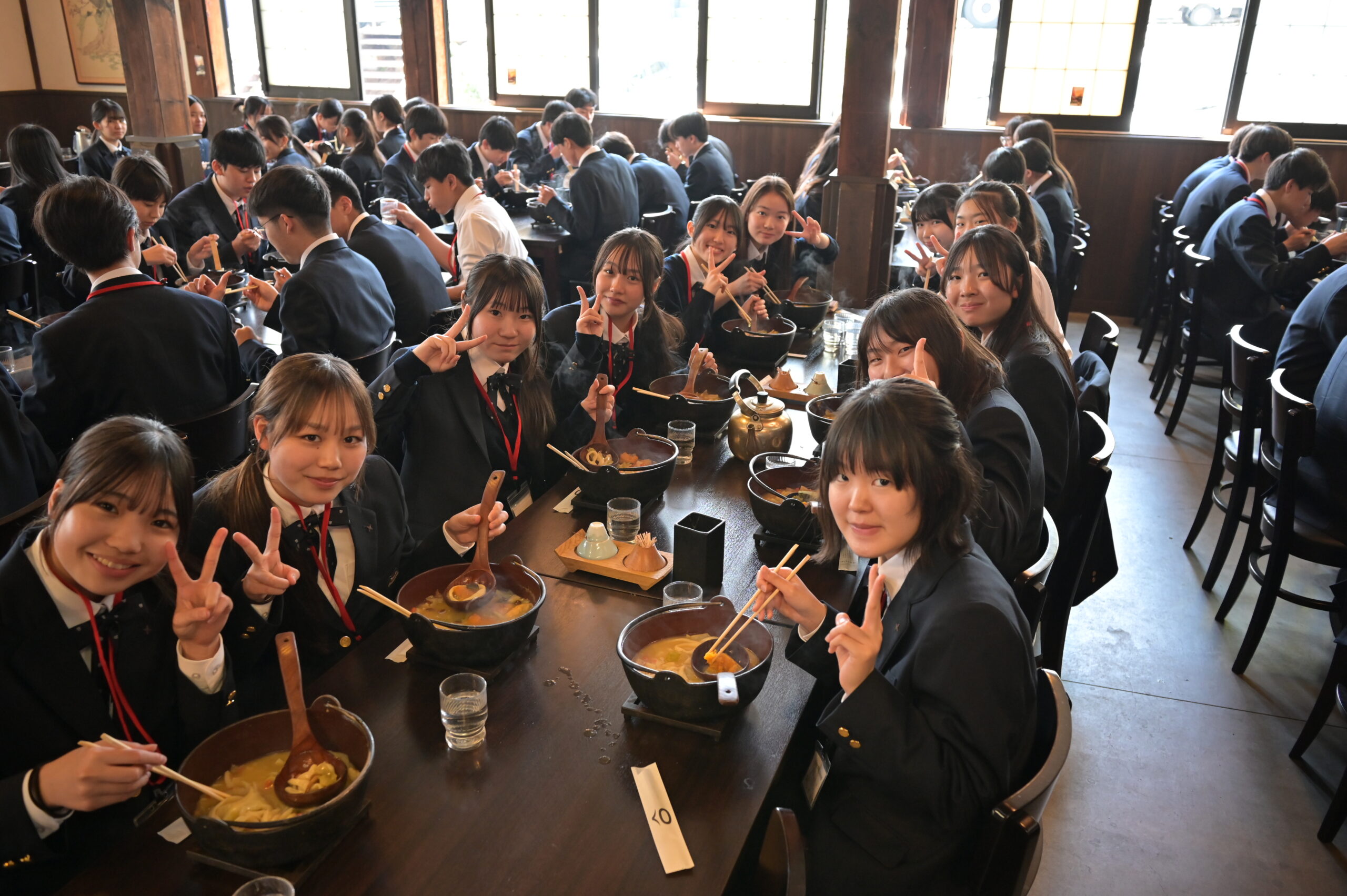 宿舎を出発した後の昼食は,ほうとう不動にて山梨名物ほうとうをいただきました。