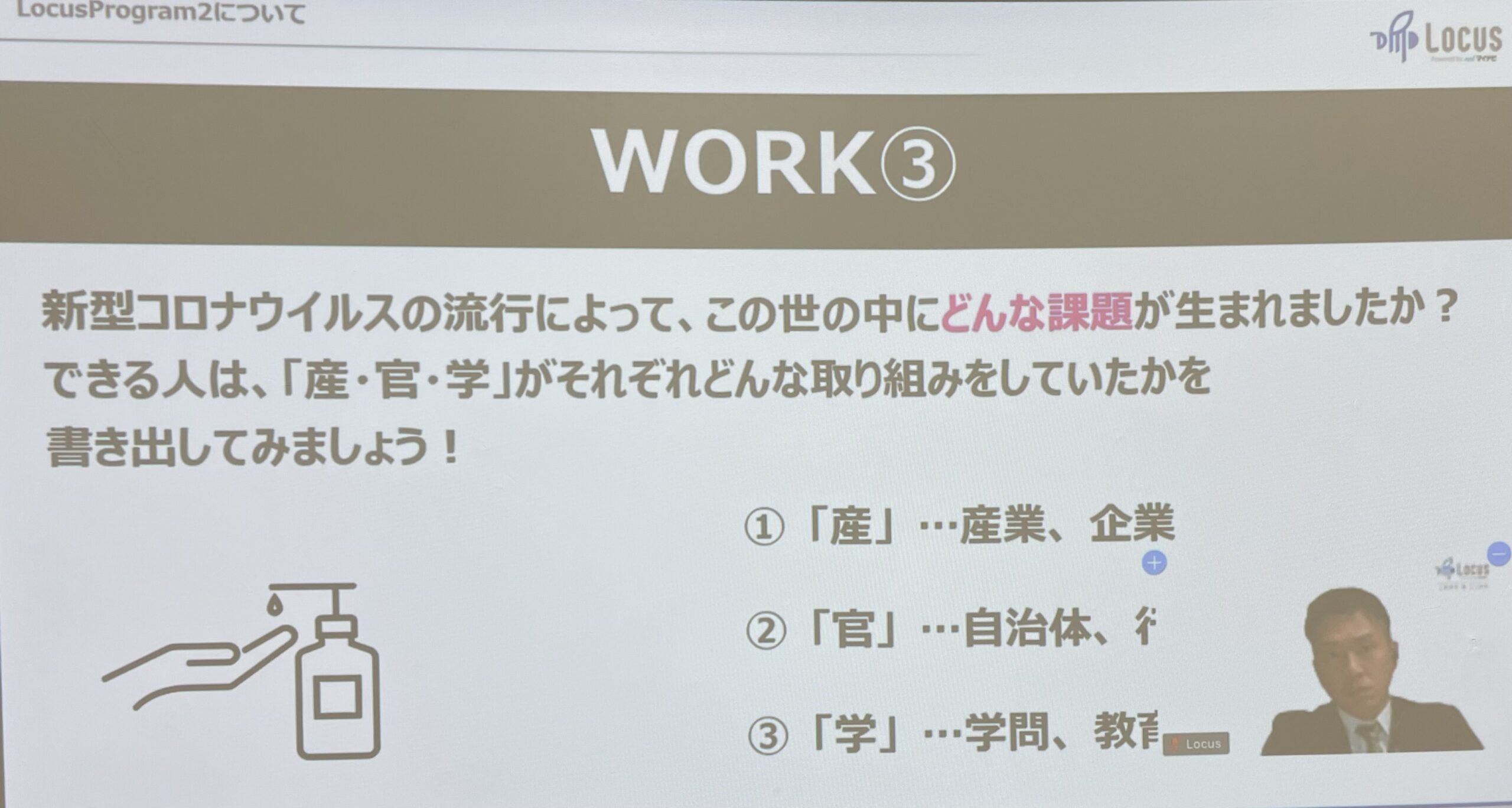 生徒達は,「日本を紹介するとき,【どのような要素・視点】から説明できるか」や「コロナ禍における【産・官・学】それぞれの取り組み」などについて考え,意見を交換し合いました。そこで,俯瞰してみると,物事は「様々な視点」から捉えることができ,さらには「様々なつながり」を見出せることを学びました。