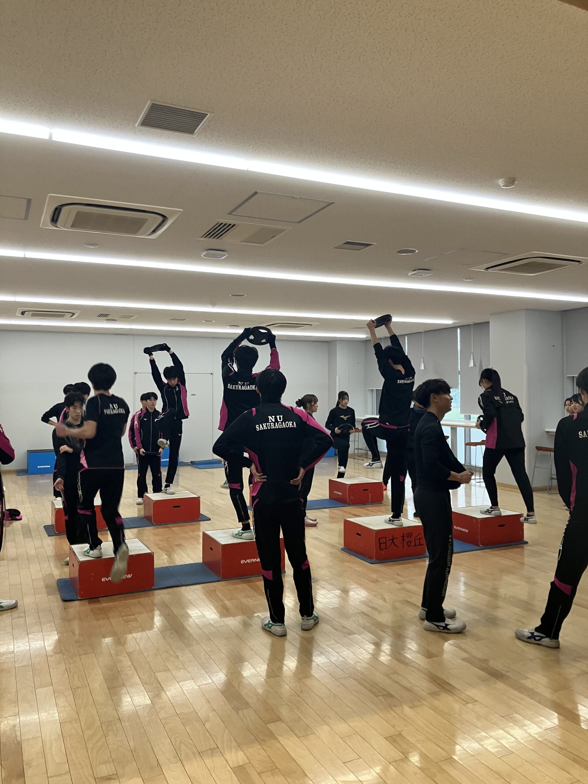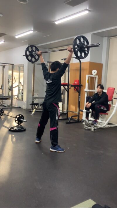 本校にはトレーニング室があります。投てきブロックのウェイトトレーニングの様子です。